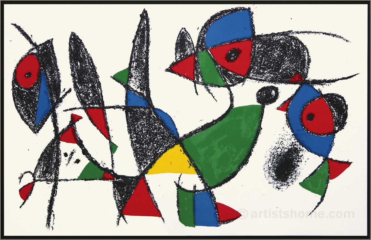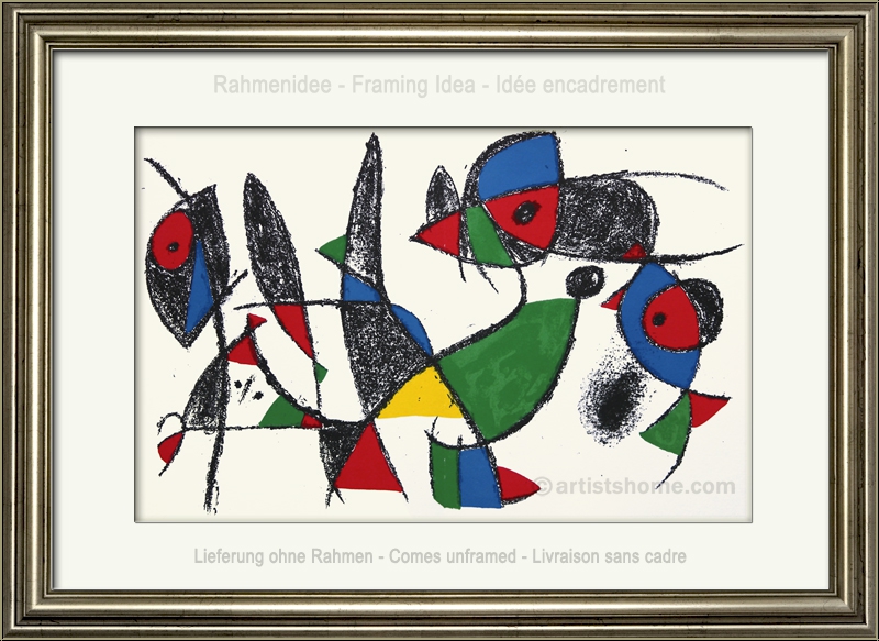 Détails :« Lithographie originale IX », sans titre, motif du dessin : Une grenouille, un poisson et un oiseau L'on peut, au mieux, deviner ce que Joan Miró a voulu exprimer à travers cette accumulation joyeuse de petits animaux en tous genres. Le fait qu'il ait, une fois encore, renoncé à donner un titre à son dessin suggère que l'artiste fait confiance au pouvoir d'imagination de celui qui contemple son œuvre. Notre conseil : ne vous creusez pas trop la tête. Profitez de cette liberté qui vous est donnée pour conférer à la lithographie sa propre cohérence temporelle, spatiale ou simplement visuelle, et sa propre signification.