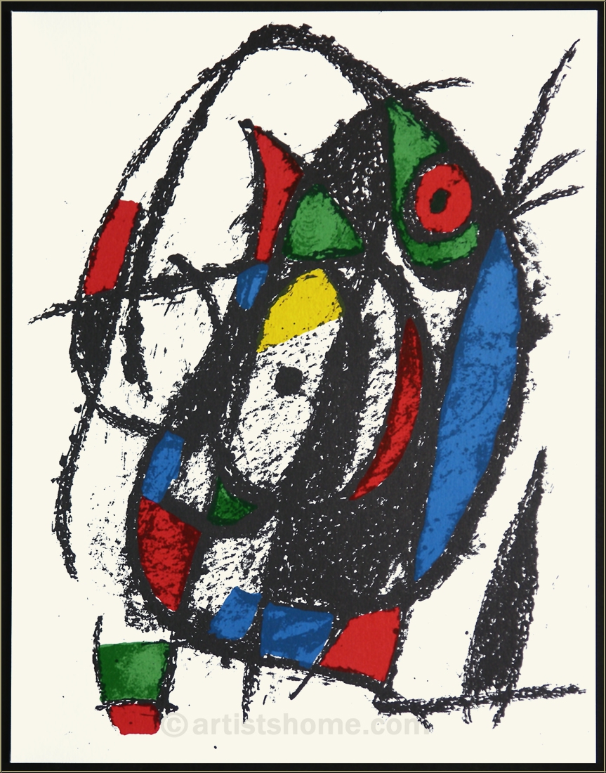 Détails :« Lithographie originale IV», sans titre, motif du dessin : La sauterelle Une sauterelle colorée se balançant sur une feuille : ce sont l'antenne arquée et le corps mince qui donnent lieu à cette association. Pourtant, il se pourrait que Joan Miró avait tout autre chose en tête lorsqu'il a réalisé ce dessin. C'est précisément ce qu'il visait en ne donnant pas de titre à ses dessins : que la personne qui les contemple se sente libre de trouver ses propres associations.