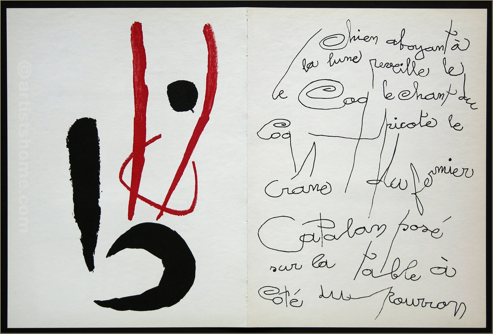 | | « Le chien aboyant à la lune » - 1952 Lithographie originale en couleurs rarissime ! Ceci n'est pas une reproduction récente ou un retirage (estampe offset ou autres) mais la lithographie originale pour la Revue Verve. | Année de réalisation: | 1952 | | Dimensions du papier: | 35,5 x 53 cm | | Tirage | Papier: | Un des exemplaires non signés de l'édition originale sur papier vélin (la lithographie a été tirée séparément sur vélin d'Arches à 80 exemplaires, numérotés et signés par l'artiste). | | Éditeur(s): | Tériade Éditeur, Paris | | Imprimeur: | Mourlot Frères, Paris | | Annotations: | Une autre lithographie et texte au verso (voir photo 3), avec pli central normal des lithographies originales publiées en doubles pages. | | Référence: | Leiris, Michel et Mourlot, Fernand. Joan Miró - Der Lithograph I, Maeght, Paris, 1972, p. 231, N° 121. Une photocopie du catalogue raisonné sera fournie. Vous recevrez, de plus, une preuve d'identité de l'œuvre (sans prix dans le cas d'un cadeau). | | État: | Details En parfait état de conservation ! Cadre non fourni. | | | Évaluations des clients : Il n'y a pas encore d'evaluations. Seulement les client qui ont acheté cet article et qui sont connecté peuvent l'evaluer. Votre nom est automatiquement affiché de manière anonyme, par ex. « Olivier M., France ».  *Valent pour les livraisons vers l'Allemagne payées via PayPal. En cas de paiement par virement bancaire, la livraison prendra un à trois jours de plus à partir du jour du virement en question. Pour connaître les délais de livraison pour d’autres pays et estimer le jour de livraison, rendez-vous ici |