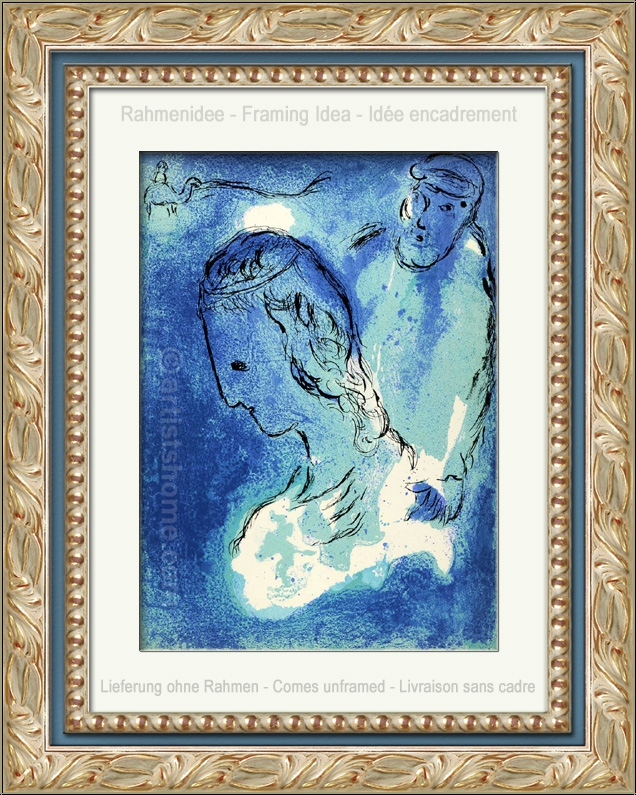 | | « Abraham et Sarah » Dans son premier cycle biblique, Marc Chagall a également représenté les patriarches, ou plutôt les pères fondateurs des douze tribus : ici, il nous montre un Abraham qui semble incrédule face à sa femme Sarah, au moment où la grossesse promise par Dieu se révèle être vraie – à « l’âge biblique » de 90 ans, Sarah va donner vie à leur fils, Isaac. Lithographie originale en couleurs de Marc Chagall pour "La Bible". Ceci n'est pas une reproduction récente ou un retirage (quadrichromie ou grano lithographie d'une « édition limitée ») mais la lithographie originale, selon les catalogue raisonnés. | Tirage : | Une des 6500 épreuves de l'édition limitée sur papier vélin, non signée (la lithographie a été tirée séparément sur vélin d'Arches à 75 exemplaires, numérotées et signées). | | Dimensions: | 35 x 26 cm (feuille / illustration) | | Éditeur: | Éditions de la Revue Verve, Tériade, Paris, 1956 | | Imprimeur: | Mourlot, Paris | | Remarques: | Référence biblique: Gen 11, 29-31 / 16 / 17, 15-22 | | Références: | Cain, J., et Mourlot, Fernand. Chagall Lithograph [I], André Sauret, Monte-Carlo 1960, p. 149-160, No. 122 Une photocopie du catalogue raisonné sera fournie. Vous recevrez, de plus, une preuve d'identité de l'œuvre (sans prix dans le cas d'un cadeau). | | État: | Details En très bon état de conservation ! Livraison non encadré. | | | Évaluations des clients : Il n'y a pas encore d'evaluations. Seulement les client qui ont acheté cet article et qui sont connecté peuvent l'evaluer. Votre nom est automatiquement affiché de manière anonyme, par ex. « Olivier M., France ».  *Valent pour les livraisons vers l'Allemagne payées via PayPal. En cas de paiement par virement bancaire, la livraison prendra un à trois jours de plus à partir du jour du virement en question. Pour connaître les délais de livraison pour d’autres pays et estimer le jour de livraison, rendez-vous ici |