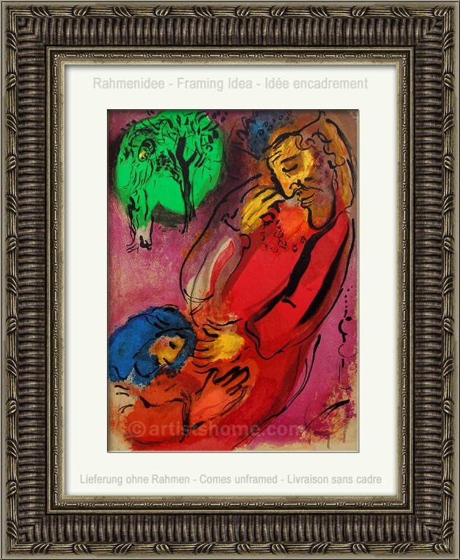 Aucune autre œuvre de March Chagall n'est aussi généreuse en nuances intenses de rouge : un bon moyen de souligner le caractère dramatique de ce moment entre un père et son fils. Car, à travers cette œuvre, Chagall ne se contente pas de nous présenter le roi David regardant d'un air désolé son fils Absalon, qui est agenouillé devant lui, implorant son pardon...et qui le trahira bientôt à nouveau. Il représente également, en haut à gauche de cette estampe, la future mort tragique de ce fils dans la forêt d'Éphraïm, tué par les troupes de son père.