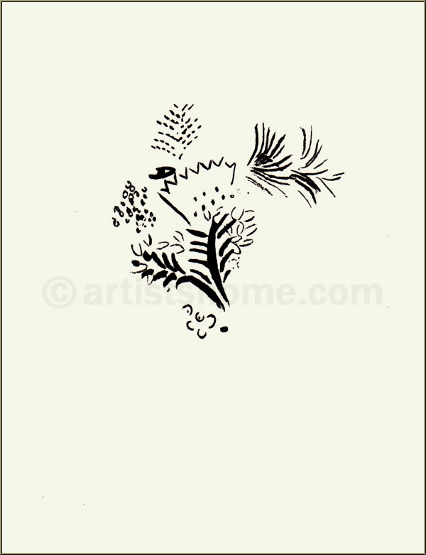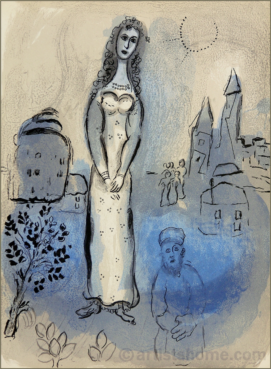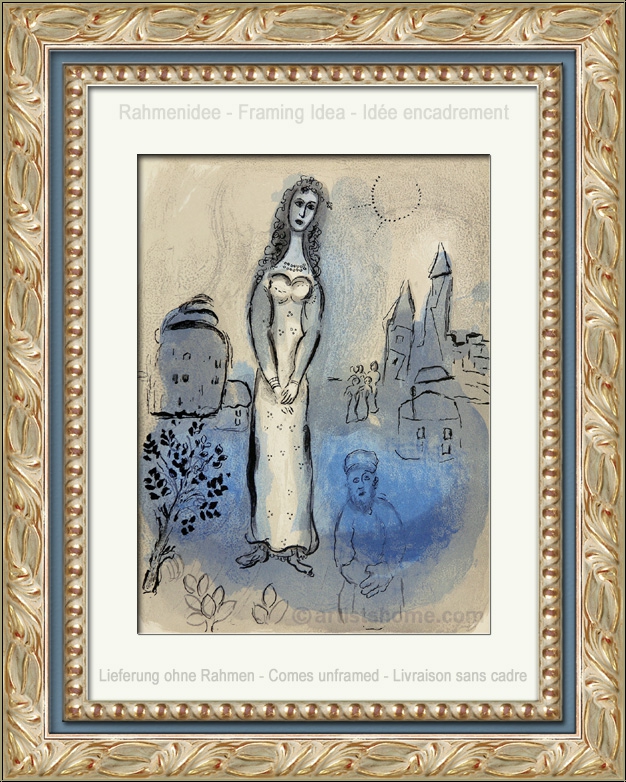 Détails :« Esther » Sur ce dessin, Chagall a représenté Esther plus grande que nature, gracieuse et ravissante, dans des tons bleus et beiges. On croirait presque la voir flotter. Ainsi rend-t-il hommage à l’une des plus grandes femmes du peuple d’Israël. Grâce à sa beauté et à sa personnalité, Esther est devenue reine à la cour du roi de Perse, Assuérus, après que ce dernier ait répudié sa femme pour désobéissance. Mardochée, l’oncle d’Esther, qui vivait également à la cour du roi, a débusqué une conspiration contre le roi et lui a ainsi sauvé la vie. Mais Haman, le plus haut fonctionnaire à la cour, détestait tous les Juifs par jalousie vis-à-vis de Mardochée. Il obtint du roi un arrêté lui donnant le droit de faire exterminer tous les Juifs vivant dans le royaume. Mardochée supplia alors à Esther d’intervenir auprès du roi. Elle s’exécuta, malgré l’interdiction de le faire sous peine de condamnation à mort. Esther réussit à convaincre le roi et sauva ainsi son peuple de l’extermination. Aujourd’hui encore, la fête juive de Pourim commémore l’acte de cette brave Esther qui risqua sa vie pour le peuple juif. On peut aussi apercevoir Mardochée en bas du dessin. Il a le regard inquiet et ses mains donnent l’impression d’être attachées à lui. L’avenir semble gris et sombre, et pourtant on remarque des signes de vie et d’espoir : le soleil, les plantes et un arbre.