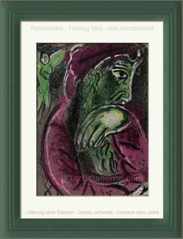 Détails :« Job désespéré » L'histoire tragique de Job, un personnage pieux et intègre, a tellement touché Chagall qu'il lui a dédié deux estampes dans son deuxième volume biblique. Job désespéré, que nous voyons ici, semble passer d'une catastrophe à l'autre, et ce malgré sa profonde foi en Dieu. Alors que même ses amis le jugent, il semble vouloir abandonner. L'obscurité l'entoure, il semble profondément préoccupé, malade et triste, et sa main soutient sa tête ; il semble désemparé. Mais cette estampe ne serait pas signée Marc Chagall si ce désespéré n'avait pas la moindre consolation : un ange vert en haut à gauche de l'estampe semble veiller à ce que le pire soit derrière lui. Mais Job ne parvient pas à comprendre le sens de ces épreuves et se demande, à chaque mauvaise nouvelle, comment Dieu peut le punir si sévèrement. Malgré tout, il ne perd pas la foi, et il en sera finalement récompensé.