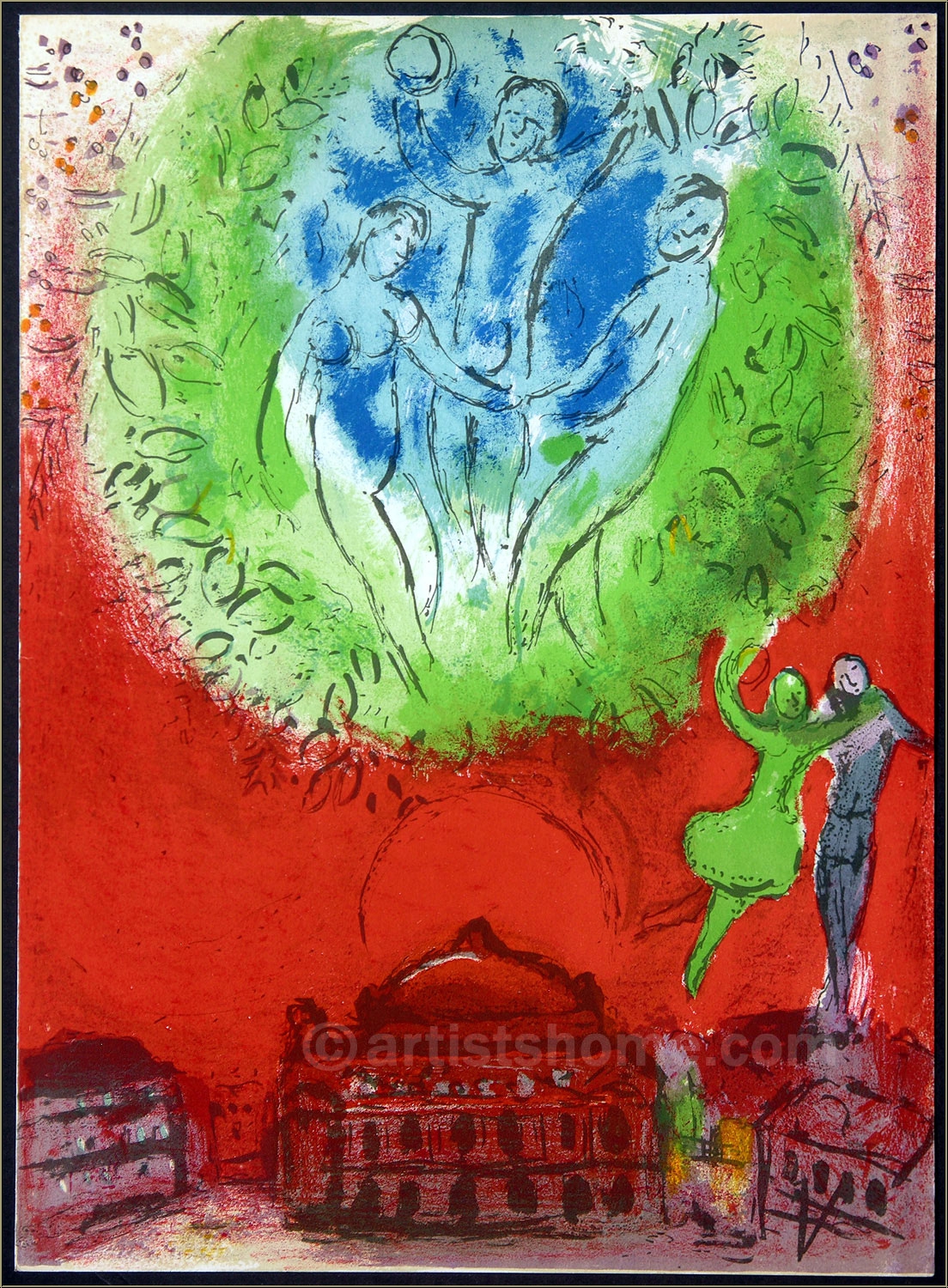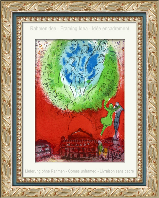 | | "L'Opéra de Paris" Ce sont dans les estampes comme "L'Opéra de Paris" que Marc Chagall exprime son envie irrépressible de couleurs, d’insouciance et de joie de vivre. "L'Opéra", avec ce couple en train de danser sur les toits de Paris et l'acte vert mai et bleu tendre d'un opéra (fictif ?) est sûrement l'une de ses lithographies les plus colorées. Le fait qu'il ait créé la célèbre peinture murale de cet opéra prestigieux quelques années plus tard prouve son engagement envers les arts de la scène, mais aussi envers cet édifice imposant pour lequel il a toujours utilisé des tons rouges intenses et lumineux. | Technique : | Lithographie originale en couleurs (Mourlot n°102), extraite de la revue Derrière le miroir n° 66-67-68 Ceci n'est pas une reproduction récente ou un retirage (estampe offset ou autres) mais la lithographie originale de 1954, selon le catalogue raisonné ! | | Année de réalisation : | 1954 | | Dimensions : | 38 x 28 cm (feuille) | | Tirage | Papier : | Une des 2500 épreuves de l'édition limitée sur papier vélin, non signée (la lithographie a été tirée séparément sur vélin d'Arches à 75 exemplaires, numérotées et signées par l'artiste). | | Éditeur : | Maeght Editeur, Paris | | Imprimeur : | Mourlot, Paris | | Remarques : | Texte imprimé au verso, comme editée | | Référence : | Cain, Julien, u. Mourlot, Fernand. Chagall Lithograph [I], André Sauret, Monte Carlo 1960, pages 131 à 135, numéro 102. Une photocopie du catalogue raisonné sera fournie. Vous recevrez, de plus, une preuve d'identité de l'œuvre (sans prix dans le cas d'un cadeau). | | État : | Details En parfait état de conservation ! Livraison non encadré. | Évaluations des clients : Il n'y a pas encore d'evaluations. Seulement les client qui ont acheté cet article et qui sont connecté peuvent l'evaluer. Votre nom est automatiquement affiché de manière anonyme, par ex. « Olivier M., France ».  *Valent pour les livraisons vers l'Allemagne payées via PayPal. En cas de paiement par virement bancaire, la livraison prendra un à trois jours de plus à partir du jour du virement en question. Pour connaître les délais de livraison pour d’autres pays et estimer le jour de livraison, rendez-vous ici |
