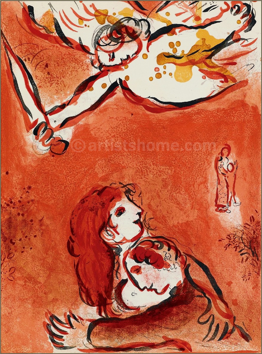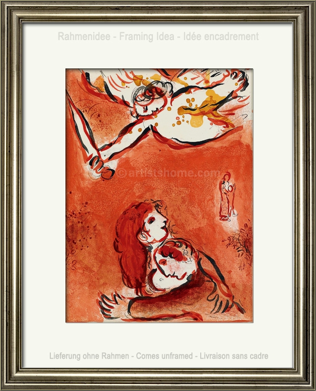 Marc Chagall a dédié ce superbe motif à l’amour de Dieu pour Israël. L’ange gardien, qui donne l’impression de flotter dans la partie supérieure du dessin, symbolise la sollicitude divine pour le peuple israélien. Chagall dépeint cet évènement dramatique d’une manière qui lui est propre.