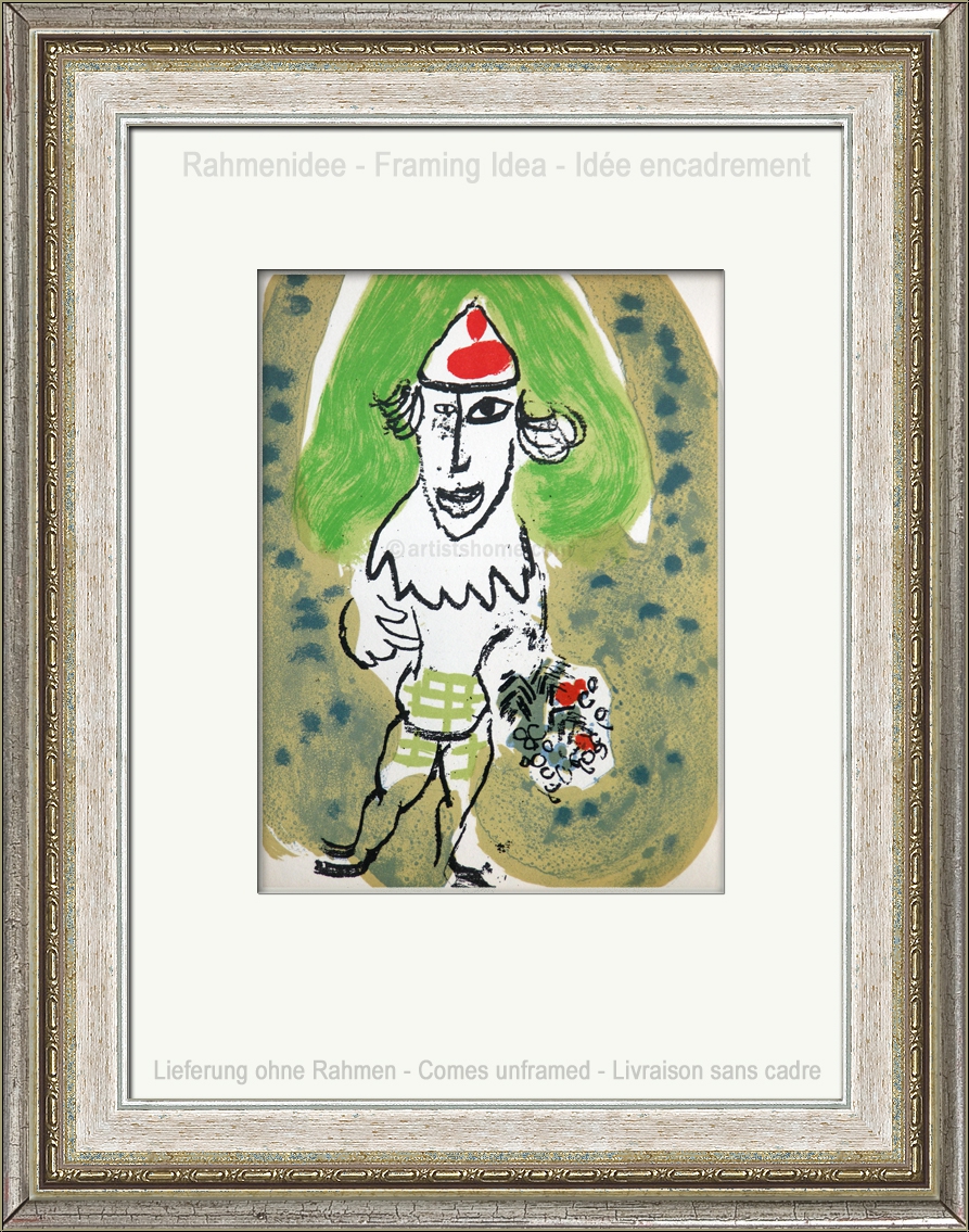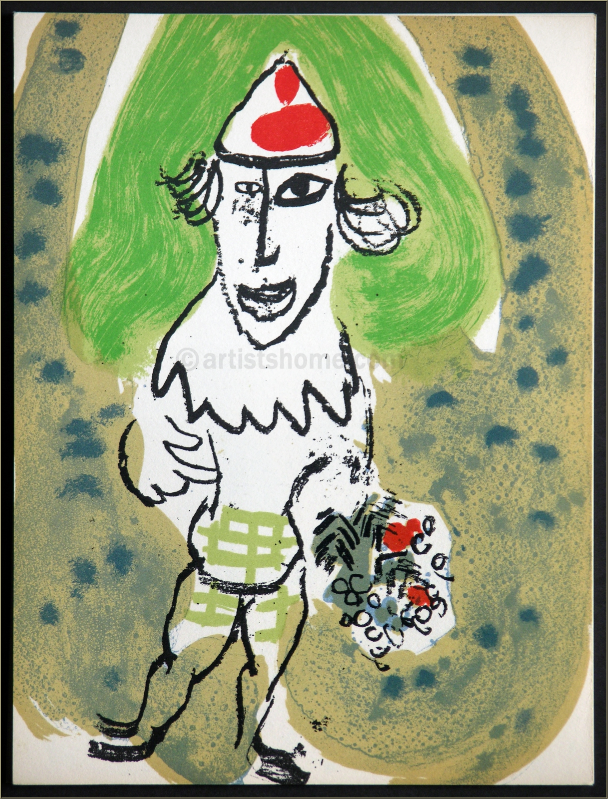 Marc Chagall: Le clown vert avec bouquet de fleurs, 1966 Lithographie