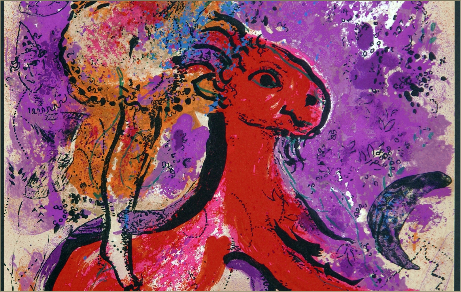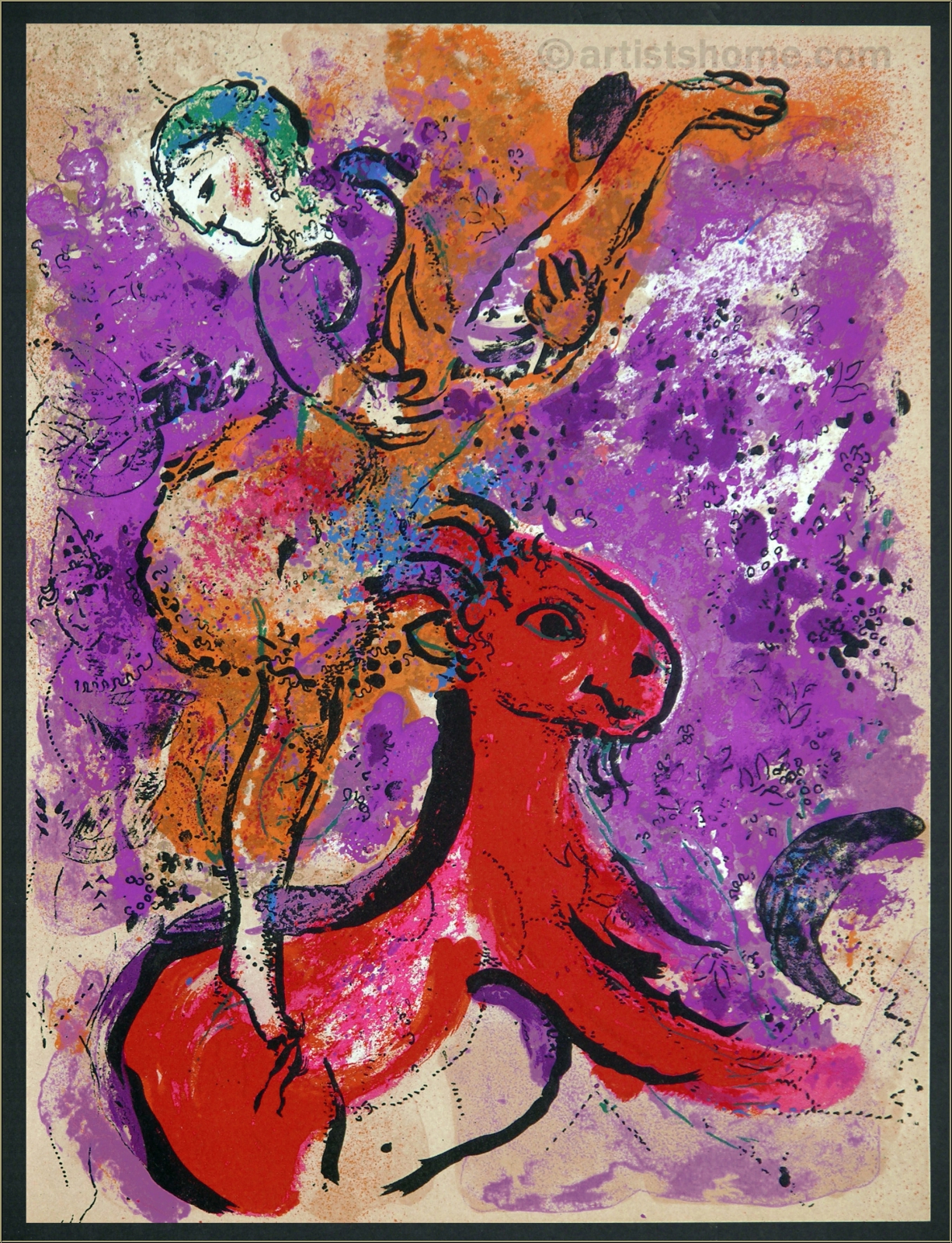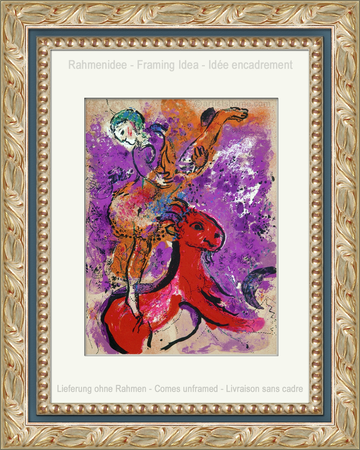 Détails :« L'écuyère au cheval rouge » Qui, sinon Marc Chagall et son œuvre enchantée, pouvait saisir l’atmosphère trépidante du cirque d’une manière aussi juste ? Si l’on observe ce dessin, on se retrouve soi-même au milieu du manège : sur la scène, on suit avec aisance les mouvements de l’acrobate, représentée dans un orange lumineux, et sa danse fougueuse sur le dos du vigoureux cheval rouge. L’observation de ses acrobaties est accompagnée d’un violet qui s’écoule à travers l’arrière-plan et réunit la composition vivace des formes et des couleurs. Dotée ainsi d’ailes par le trait de Chagall dans cette œuvre, la danseuse semble savourer son entrée en scène. Son allure reste élégamment modeste, alors qu’elle jaillit avec entrain sous la lumière des projecteurs et attire tous les regards sur elle. Une force d’attraction créée par Chagall de façon à la fois énergique et joueuse. À l’arrière-plan gauche, on croit reconnaître un clown, esquissé en traits noirs. Avec une linéarité déterminante et expressive, Chagall fait ressortir, au-dessus de ces réminiscences à l’arrière-plan, les deux principaux représentants de la soirée : l’écuyère éblouissante et son cheval galopant. En observant cette magnifique lithographie originale de Marc Chagall, qui se fait de plus en plus rare, nous devenons spectateur d’un vibrant spectacle de cirque. Il n'est guère possible de ne pas plonger dans ce scénario pictural et continuer à rêver d’une soirée sous un chapiteau de cirque, quelque part dans Paris.