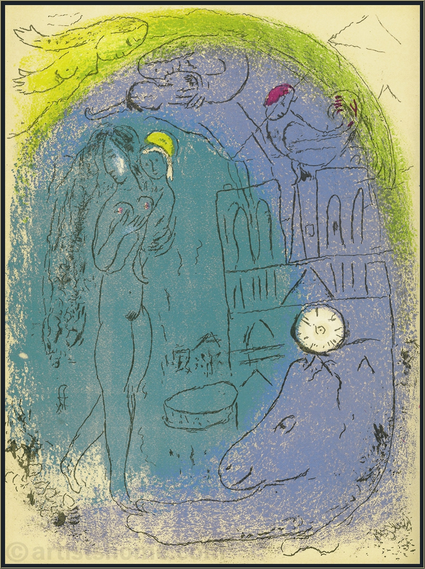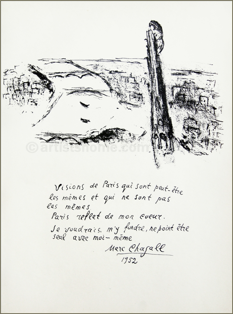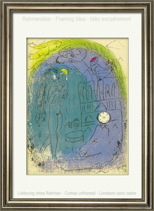 | | « Mère et enfant devant Notre-Dame » Mourlot 82 Poétique, cette lithographie en couleurs de Chagall de 1952 est l’une de ses premières œuvres de ce genre. Il l’a dessinée dans le cadre de son premier cycle parisien intitulé « Vision de Paris », un hommage à sa ville d’adoption. A travers cette œuvre, il est parvenu à capturer une atmosphère rare, presque paradisiaque, de la capitale française. La représentation de la cathédrale Notre-Dame de Paris est un dessin des plus délicats. On aperçoit les protagonistes du dessin sur le parvis : une Vierge Marie « contemporaine » et son enfant Jésus. Marie, à qui la cathédrale est dédiée, porte son Jésus dans les bras. Harmonieuse, la composition est entourée d’un bleu turquoise et d’un cercle vert-jaune qui donne l’impression d’encercler la scène comme une brise nocturne. Chagall a accordé autant d’importance au coq, symbole national français. Depuis les tours de Notre-Dame, il observe l’image paisible de cette mère portant son enfant. La combinaison de couleurs tendres et d’éléments figuratifs et abstraits dans ce dessin créée un ensemble équilibré, et l’harmonie que Chagall transmet à travers cette œuvre touche également celui qui la contemple. Ceci n'est pas une reproduction récente ou un retirage (quadrichromie ou grano lithographie d'une "édition limitée") mais la lithographie originale, selon les catalogues raisonné. | Année de réalisation: | 1952 | | Tirage / Papier | Un des 6000 exemplaires de l'édition originale sur papier vélin, non signée. La lithographie a été tirée séparément sur vélin d'Arches à 75 exemplaires, numérotés et signés par l'artiste. | | Dimensions: | 35,5 x 26,5 cm (feuille / illustration) | | Éditeur: | Éditions de la Revue Verve, Paris | | Imprimeur: | Mourlot, Paris | | Annotations: | Une autre lithographie originale au verso "Les Ponts de la Seine" (Mourlot No. 80) | | Références: | Cain, Julien, Mourlot, Fernand. Chagall Lithograph [I], André Sauret, Monte Carlo 1960, pages 122-123, n° 82 et 80. Une photocopie de la page du catalogue raisonné sera fournie. Vous recevrez, de plus, une preuve d'identité de l'œuvre (sans prix dans le cas d'un cadeau). | | État: | Details En parfait état de conservation ! Livraison non encadré. | | | Évaluations des clients : Il n'y a pas encore d'evaluations. Seulement les client qui ont acheté cet article et qui sont connecté peuvent l'evaluer. Votre nom est automatiquement affiché de manière anonyme, par ex. « Olivier M., France ».  *Valent pour les livraisons vers l'Allemagne payées via PayPal. En cas de paiement par virement bancaire, la livraison prendra un à trois jours de plus à partir du jour du virement en question. Pour connaître les délais de livraison pour d’autres pays et estimer le jour de livraison, rendez-vous ici |