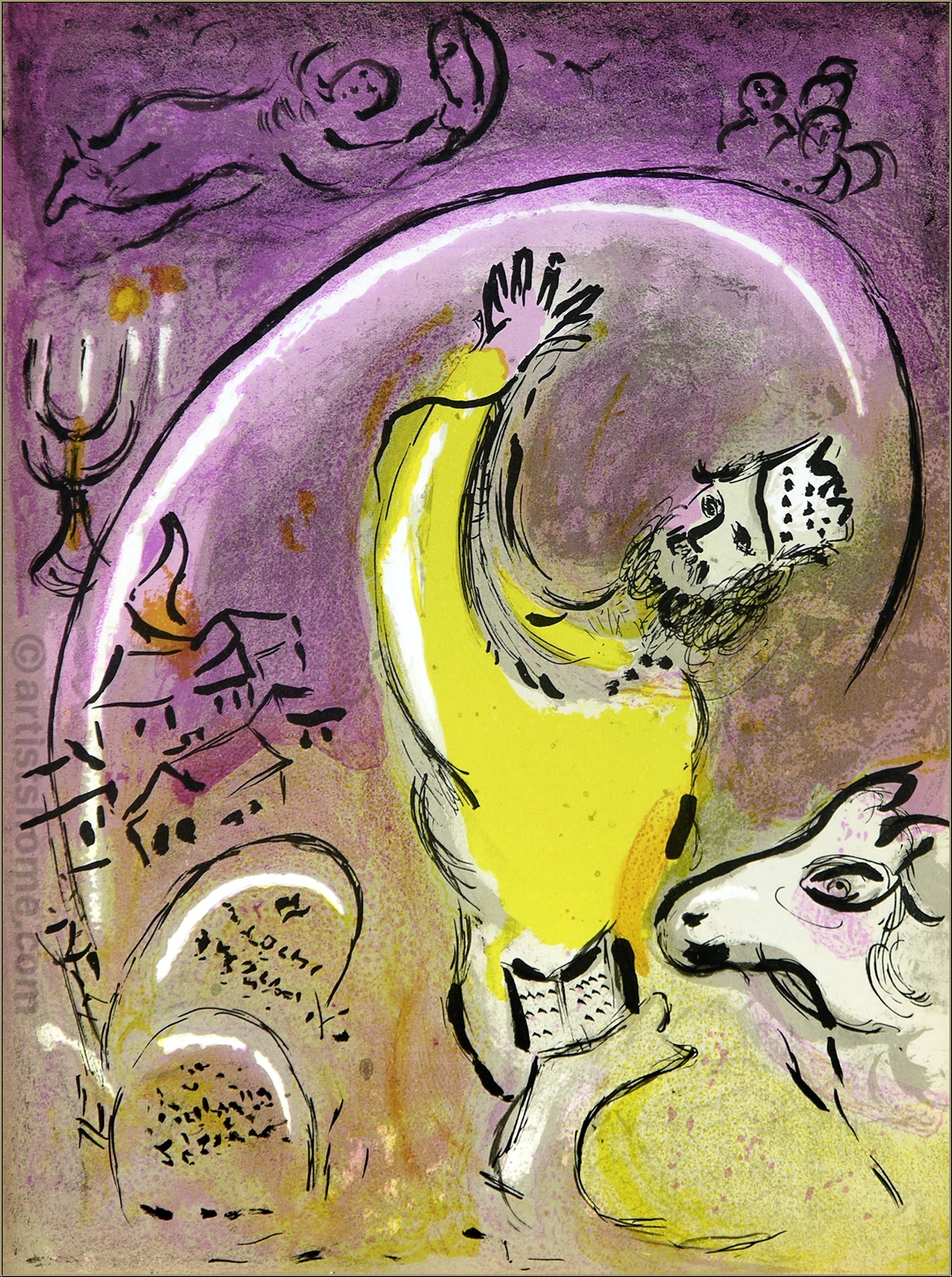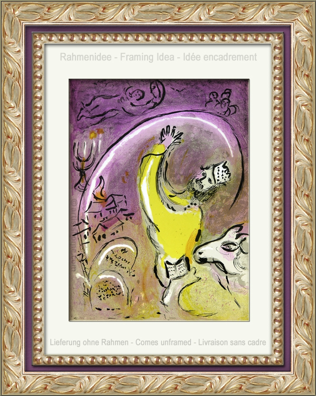 Détails :"Salomon" (Les Rois) Salomon est considéré comme le plus sage de tous les rois juifs. Aujourd’hui, encore, on parle de "jugement de Salomon" pour désigner une décision judicieuse et sage. Sur ce dessin, Chagall a représenté le roi avec les bras levés, comme touché par la lumière. L’artiste joue sûrement ainsi avec la relation de confiance qu’entretient Dieu avec Salomon et sa manière pacifique de gouverner. Mais sa couronne glisse légèrement... le roi est complètement idéalisé malgré tous ses travers humains : son goût du faste, par exemple, qui l’a amené à exploiter ses sujets. En bas à gauche, on aperçoit les Tables de la Loi, et au-dessus d’eux le chandelier à sept branches : un rappel du fait que Salomon a fait construire le premier temple de Jérusalem avec des matériaux précieux. Un arc de lumière s’étend au-dessus du roi comme pour le protéger, et marque une démarcation nette avec le ciel. Peut-être Chagall veut-il ainsi souligner le fait que le roi reste un homme malgré tous ses pouvoirs et qu’il n’est pas un dieu, comme c’était le cas à la même époque avec les pharaons d’Egypte. La couleur violette de l’estampe frappe particulièrement l’œil. Elle suggère que la conduite de Salomon était influencée et déterminée par l’esprit de Dieu.