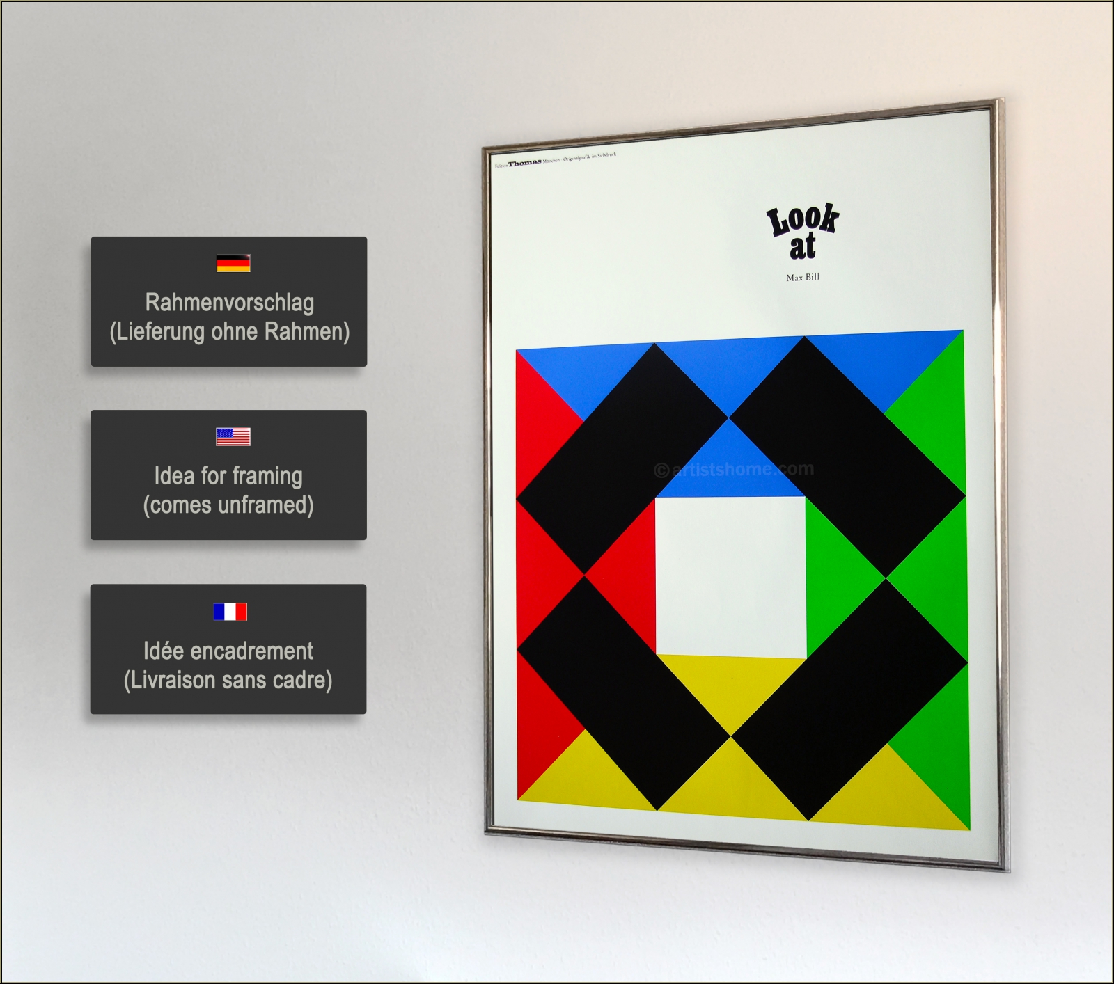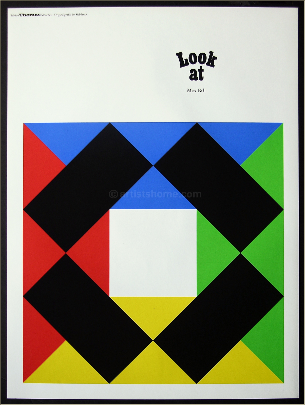 Détails :« Look at Max Bill » Edition Thomas Affiche d'exposition avec une sérigraphie originale (composition au centre blanc), imprimée en rouge, bleu, jaune, vert et noir.