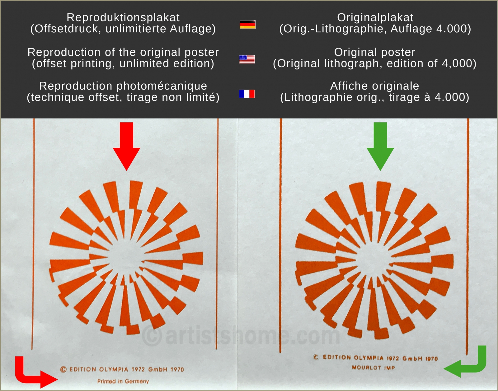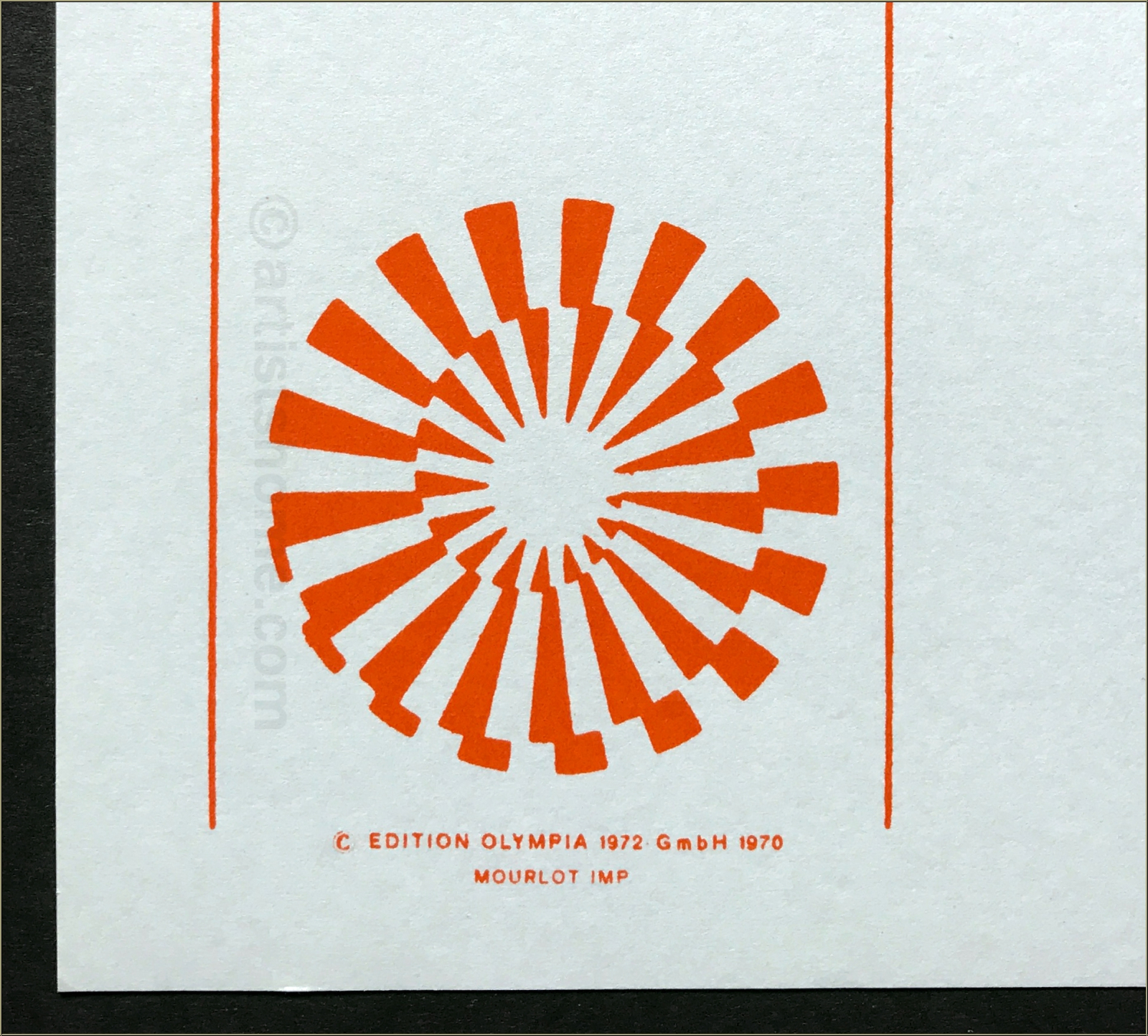 Détails :« Olympische Spiele München » (Jeux Olympiques de Munich) 1972 Pierre Soulages fait partie des 28 artistes qui ont été approchés par la société Les Editions Olympia 1972, une entreprise fondée en 1968 avec l'objectif de réaliser des affiches pour les Jeux Olympiques de Munich. Le but de cette opération était de représenter les valeurs olympiques par des artistes de tous styles, reconnus mondialement, grâce à une série d’affiches. Dès le début du projet, le comité d’organisation avait défini deux catégories d’affiches : - Des affiches originales en éditions limitées, imprimées en lithographie et sérigraphie, dédiées aux collectionneurs ; On a demandé aux artistes de sélectionner eux-mêmes les ateliers d’impressions pour ces tirages originaux. Ainsi, les mentions d’impression (le nom de l’atelier d’impression), au nombre de 11 (une par affiche), doivent être consultées attentivement si l’on est intéressé par l’acquisition de l’une de ces affiches. Il est en effet difficile de faire la différence entre les affiches originales et les reproductions en offset, surtout sur internet. Cette différence peut être faite en étant attentif aux caractéristiques comme la technique d’impression, le papier employé, ainsi que les mentions d’impression. Pour imprimer sa "Lithographie n°29", Pierre Soulages a choisi le fameux atelier de lithographie Mourlot à Paris, où il a fait imprimer la plupart de ses lithos originales. Voici les différents tirages (ou variantes) du poster pour les Jeux Olympiques de Soulages : 1. Affiche originale en lithographie (avec la lettre, mais sans la signature dans la planche) sur papier Arches (104,5 x 69,5 cm). Signé à la main et numéroté. Edition de 200 exemplaires. Mention de l'imprimeur "Mourlot Imp." L’affiche que nous vous proposons et l’un des 4000 exemplaires imprimé par le fameux atelier Mourlot, portant la mention "Mourlot Imp.".