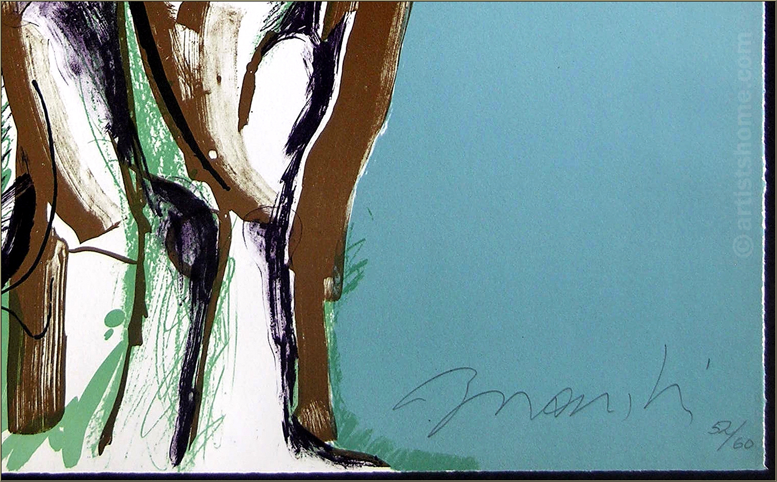 Détails :« Spiegel III » Figure abstraite en bleu et vert clair, violet, marron et noir Après une longue abstinence, loin de son œuvre imprimée (déjà peu abondante), Rolf Szymanski retourne enfin à la lithographie en 1971. Le résultat étonnant et haut en couleurs : trois remarquables œuvres de grande envergure, intitulées « Spiegel I-III » (Miroir), et destinées à son portfolio « Portraits ». Il s’agit ici de la troisième estampe, intitulée « Spiegel II », une figure abstraite qui n’est pas sans rappeler le penchant de Szymanski pour la sculpture.