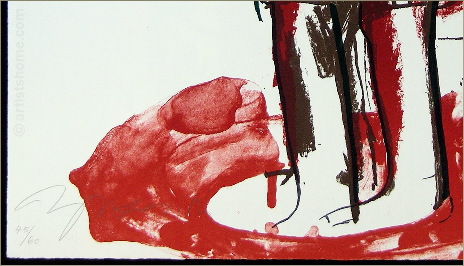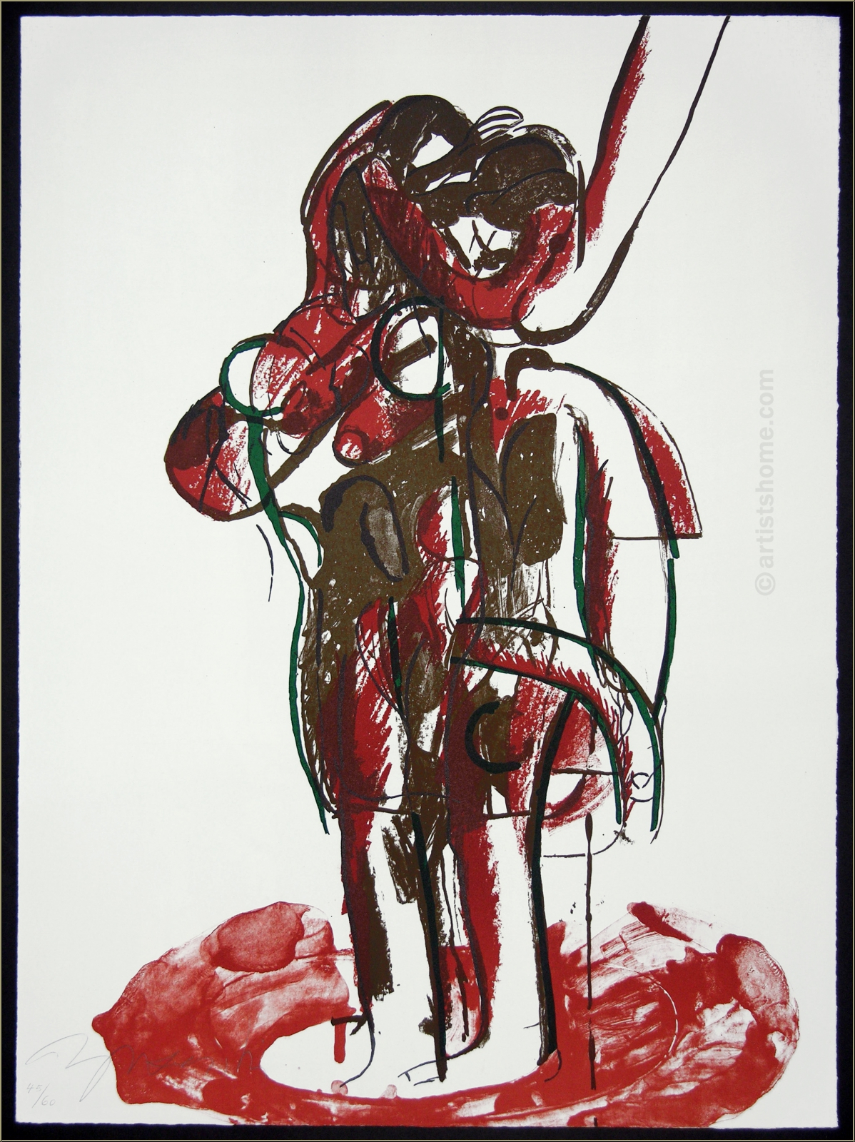 Détails :« Spiegel II » Figure abstrait en rouge, marron, noir et vert foncé Après une longue période d’abstinence, loin de son œuvre imprimée (déjà peu abondante), Rolf Szymanski retourne enfin à la lithographie en 1971. Et on ne peut que s’en réjouir ! Le résultat : trois remarquables œuvres de grande envergure, intitulées « Spiegel I-III » (Miroir I-III), et destinées à son portfolio « Portraits ». Il s’agit ici de la deuxième estampe, intitulée « Spiegel II », une figure abstraite où règnent de fascinants tons rouges.