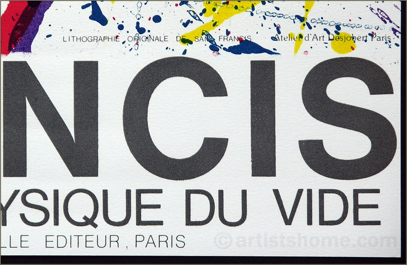 Détails :« Sam Francis » Lithographie originale Affiche réalisée en lithographie originale, pour la présentation d'un nouveau livre de l'auteur Michel Waldberg sur le peintre américain « Metaphysique du vide »