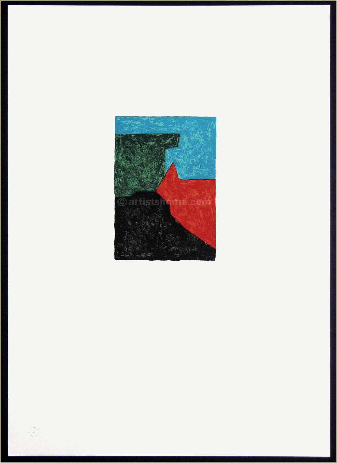 Détails :« Composition noire, rouge, bleue et verte » Cette estampe, produite par l’artiste à peine quelques mois avant sa mort en octobre 1969, est la dernière de ses œuvres gravées. La lithographie est construite sur 4 segments de couleurs, dont un bleu turquoise inhabituellement intense et éclatant, et un noir cassé, que Poliakoff a placé dans le champ, mais à l’opposé. Cette estampe a également été utilisée en 1973, pour une affiche d’exposition de la Galerie Erker.